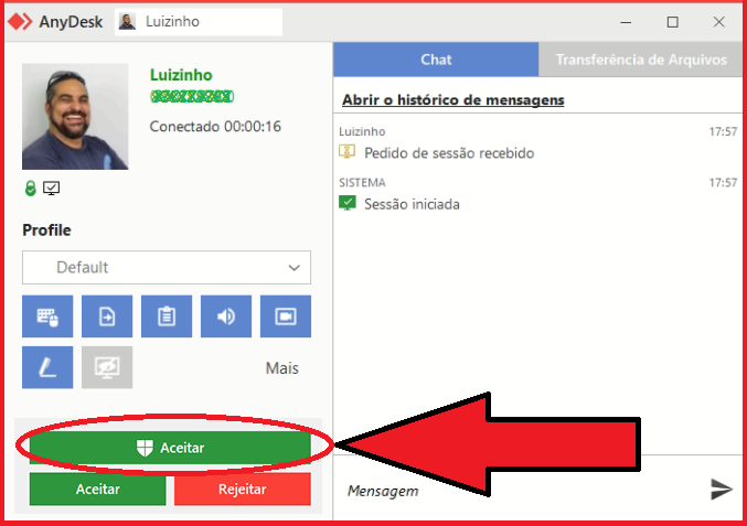 5- Eu então enviarei uma solicitação de acesso em que aparecerá minha identificação e de minha máquina. Clique no ACEITAR que possui um escudo o lado |